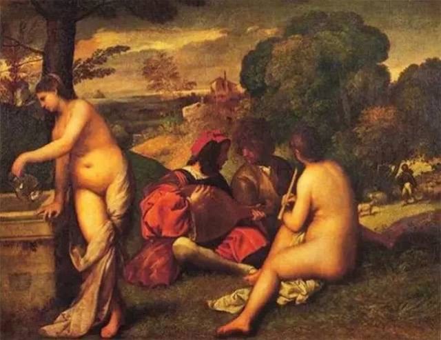 《田园合奏》又称《乡村音乐会》,是乡土自然美和女性裸体美的绘画结合,不仅表现了画家对时代精神的探索,还反映了16世纪以来威尼斯绘画风格的审美理想。这件作品先是由乔尔乔内绘制,后由提香继续完成的。这件作品展示了一幕耽于幻想的神、人心灵交流的幻境,充满神秘的诗意,体现了当时人们对美的梦幻般向往。