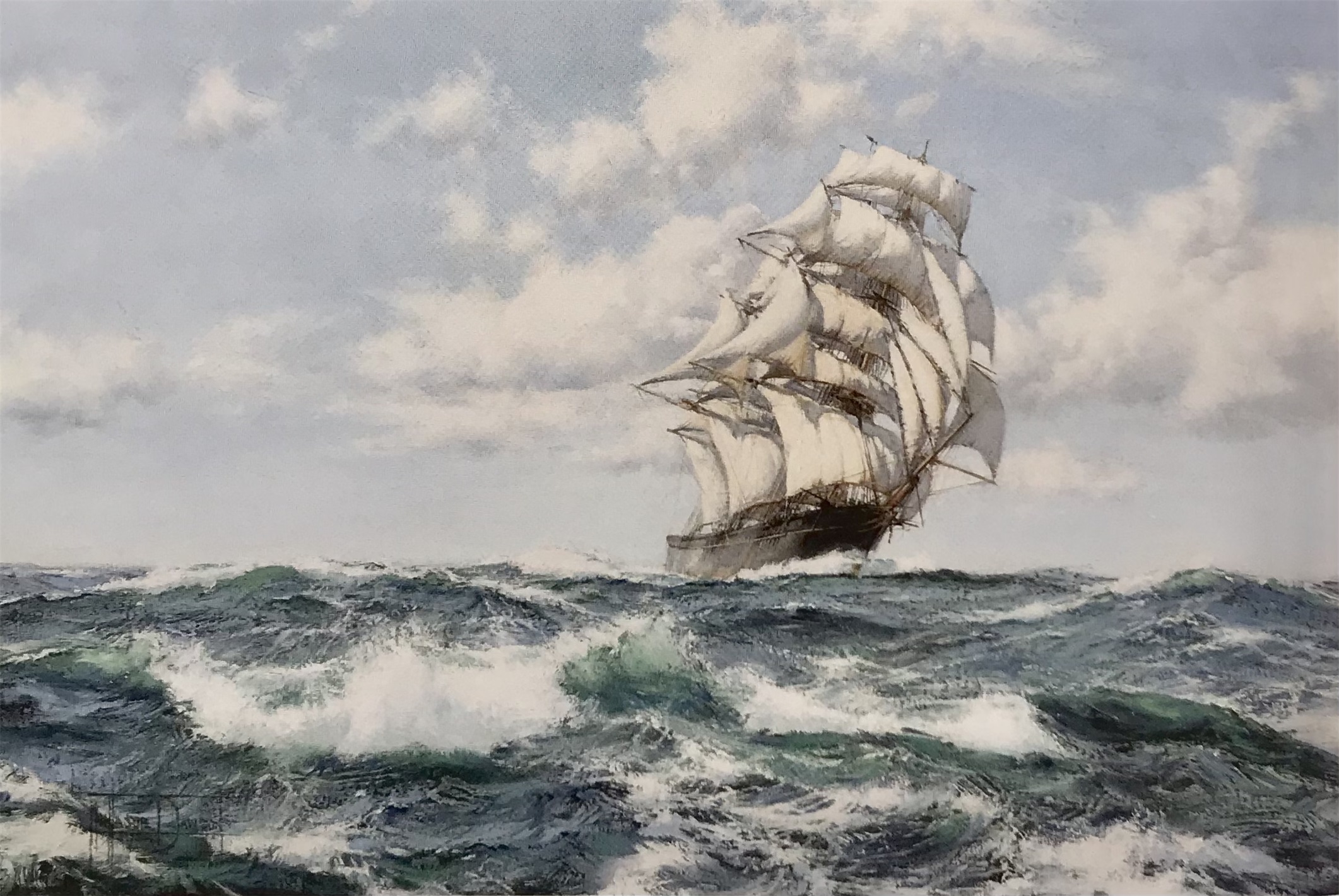 英国画家蒙塔古.道森油画,189年他出生在伦敦,第一次世界大战后,他已经是一个具有自己风格的成功的海洋画家,他描绘海水用笔浑厚有力,颜料厚实色彩饱满,他笔下的帆船好像一名勇士,总是单枪匹马,劈波斩浪地在海洋中行进,天空飘荡的云彩和波涛汹涌的海洋也用拟人的手法衬托出帆船的勇猛,总是无所畏惧,勇往直前。可以定制。